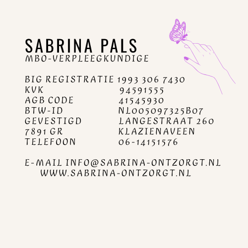 Met een diep hart voor de medemens en een persoonlijke aanpak, sta ik klaar om u te ontzorgen. Ik leef me in uw situatie in en denk graag met u mee. Het draait bij Sabrina (ont)zorgt niet alleen om de aandoening, maar om de mens erachter. Zorg bieden zoals ik zelf verzorgd zou willen worden, dat is mijn missie...